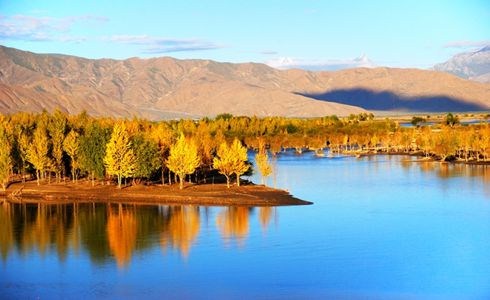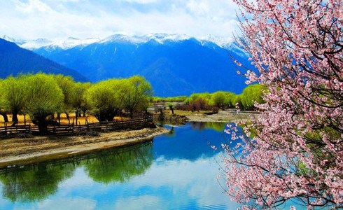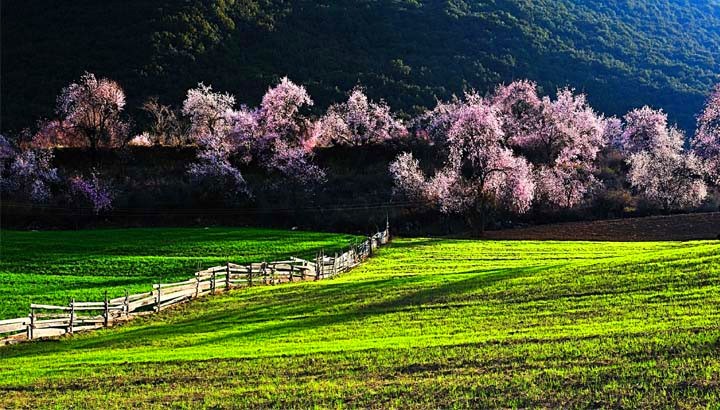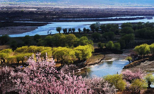 在林芝縣城東南方向約5公里處,有一片天然野生桃林,人們稱它為桃花溝。桃花溝三面環(huán)山,高處有水源,四周林木蔥蘢,終年碧綠蒼翠,澗有流水,清澈見底;溝內(nèi)野桃鱗次櫛比,林間鳥雀歡噪,既靜僻又幽雅,不失為一處難得的大自然樂園和桃果基地。桃花盛開在每年的3月,此時(shí)寒意未盡,嬌嫩的桃花在皚皚雪山下卻顯得格外的柔媚。冬天還未卸去銀裝,這里已然是花的海洋。那粉嫩的桃花如同姑娘臉色動(dòng)人的高原紅,成千上萬,各展其枝。桃花溝三面環(huán)山,溪水傾瀉而下,岸邊野桃勃勃。不遠(yuǎn)處的尼洋河溪畔,桃林與麥田交相呼應(yīng)。要觀賞如此美景,最好的起始點(diǎn)是從桃花村開始,經(jīng)桃花溝,東瓊村。途中,桃花、油菜花還有皚皚雪山交相輝映,讓人心醉其中。